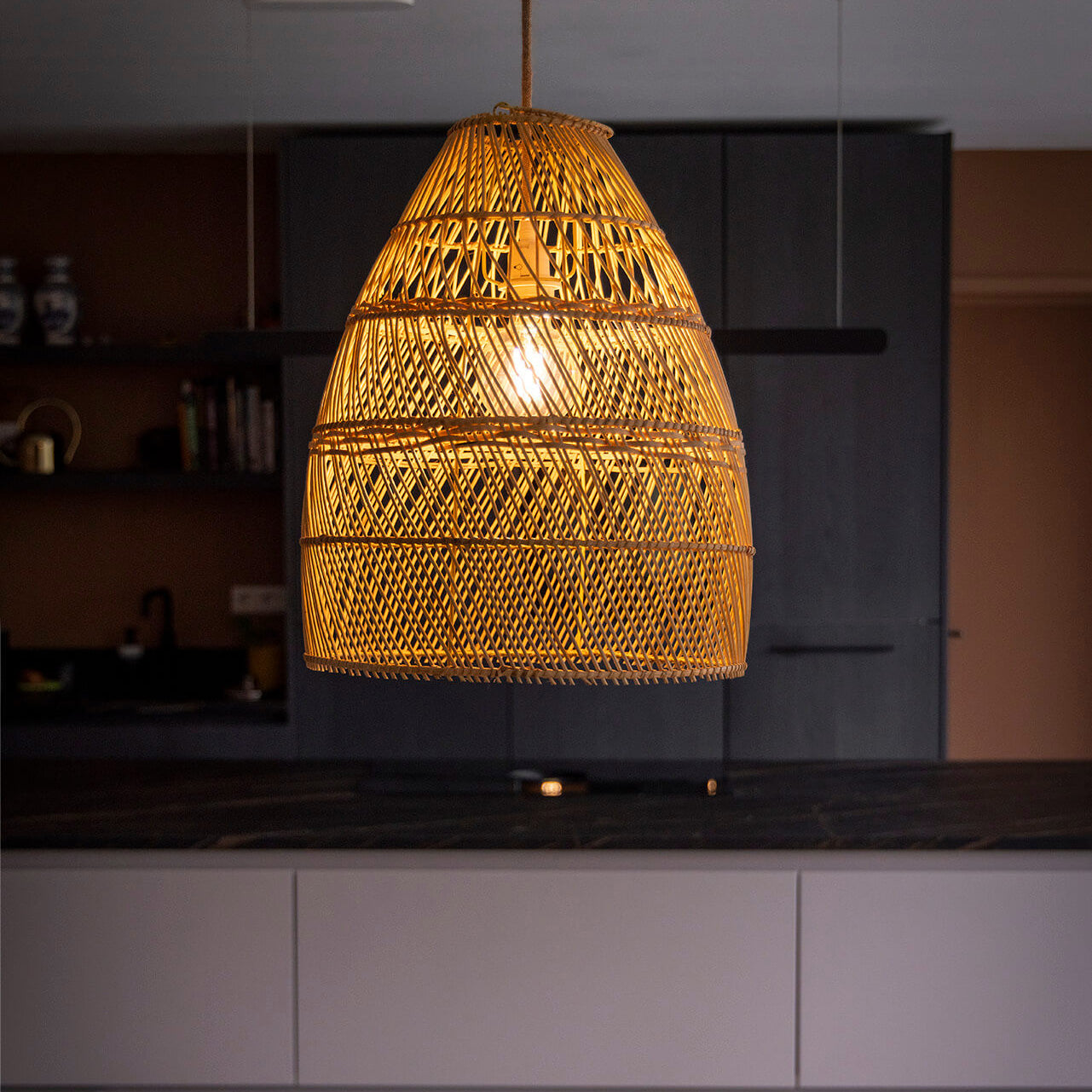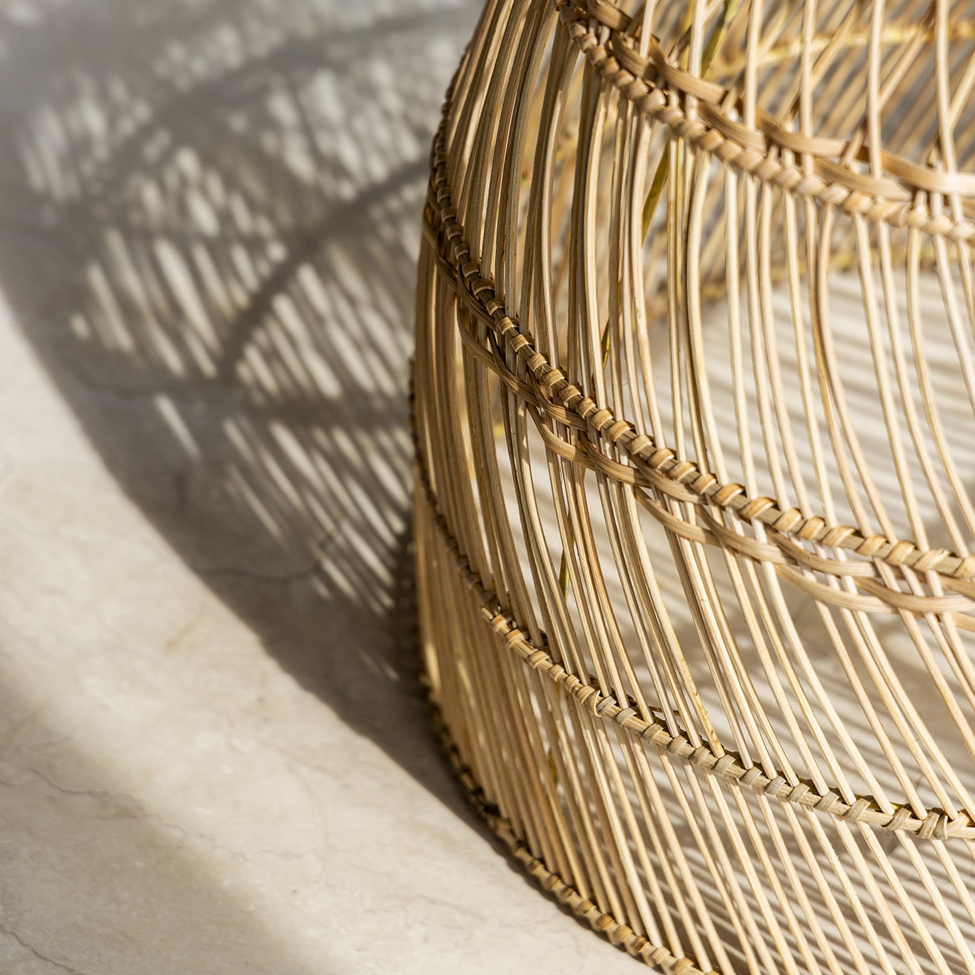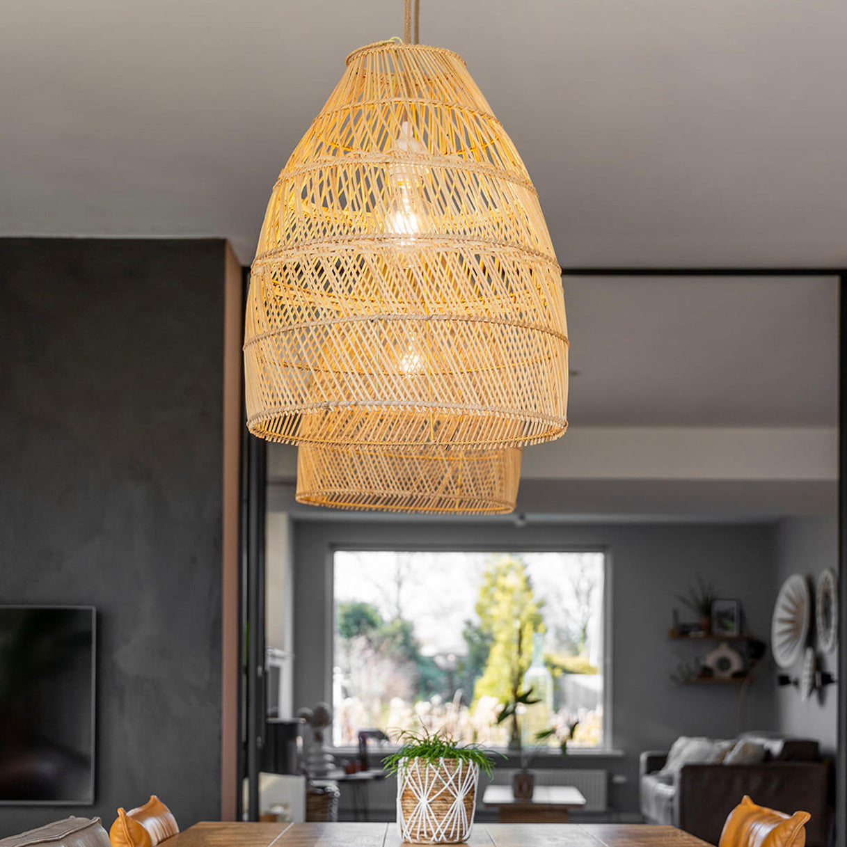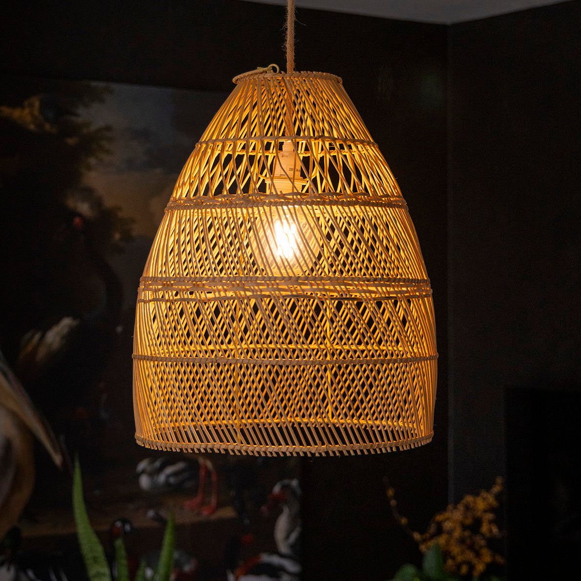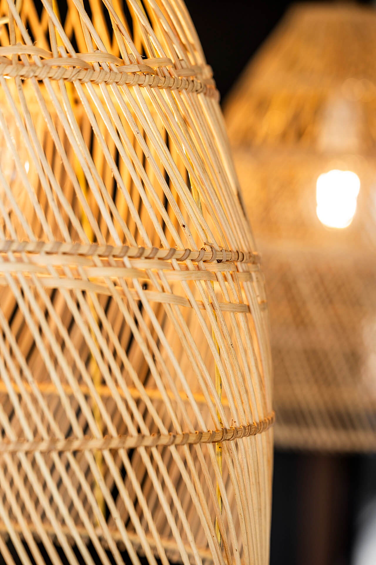Deze ronde hanglamp brengt een sfeervol lichtspel in je interieur. Met zijn schuin geweven patroon van natuurlijk rotan werpt deze lamp prachtige schaduwen op de muren en het plafond, waardoor een warme en dynamische sfeer ontstaat. De natuurlijke tinten en verfijnde vorm maken van deze lamp een subtiele, elegante toevoeging aan elke ruimte.