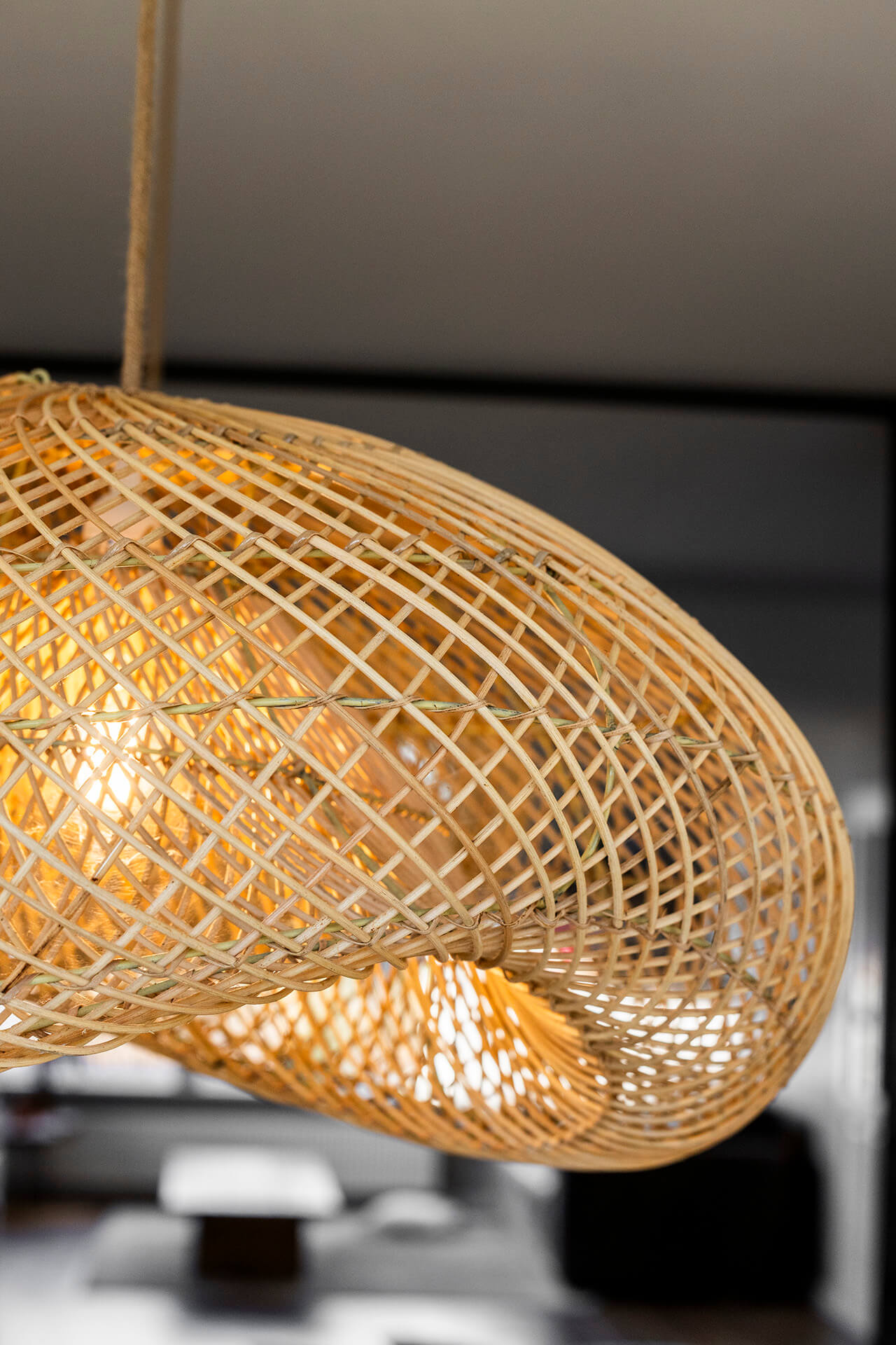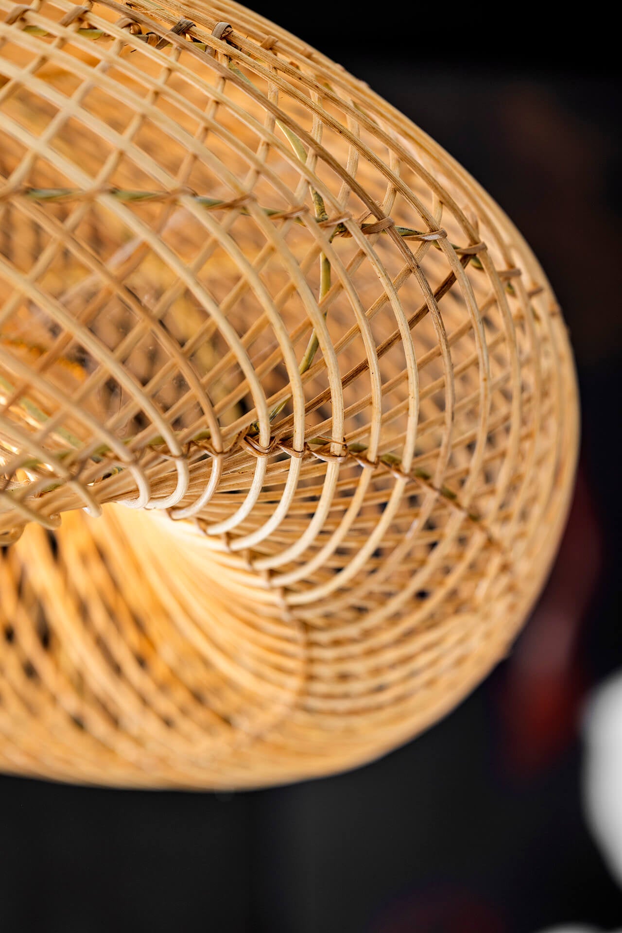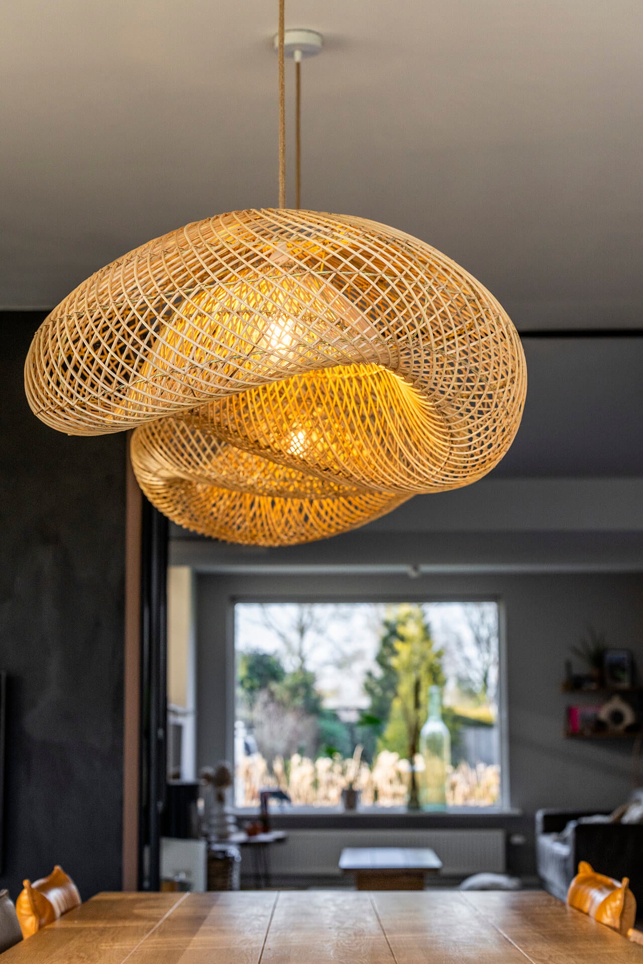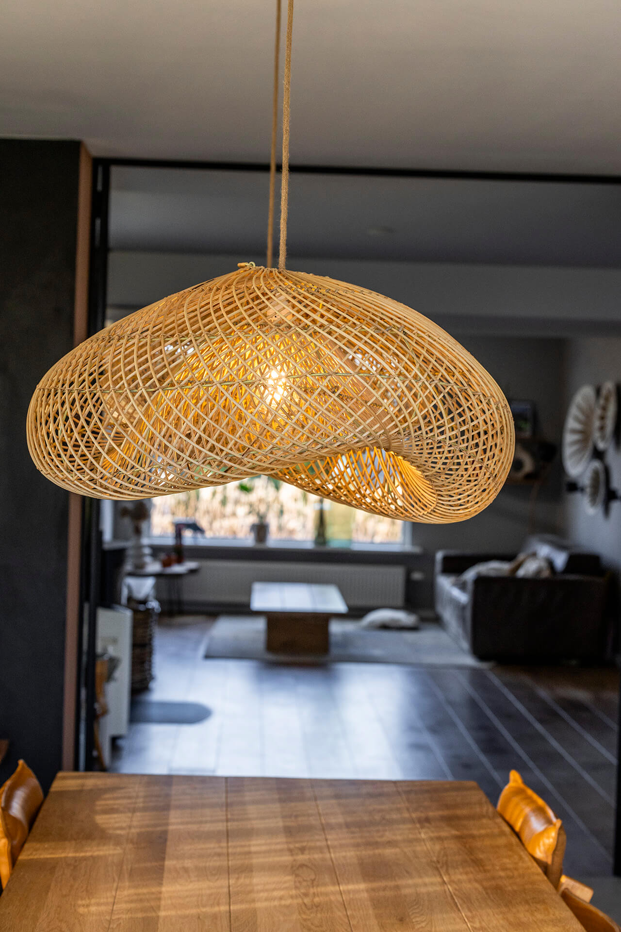 Deze hanglamp heeft een prachtige ovale 3D vorm. De lamp is handgemaakt van rotan en is een echte eyecatcher boven elke eettafel. Deze hanglamp verspreidt een zachte, uitnodigende gloed die elke ruimte verwarmt en geeft mooie schaduwen op het plafond. De natuurlijke tinten en elegante ronde vorm geven de lamp een verfijnde, ingetogen luxe uitstraling, ideaal om van jouw eetkamer een stijlvolle plek te maken.