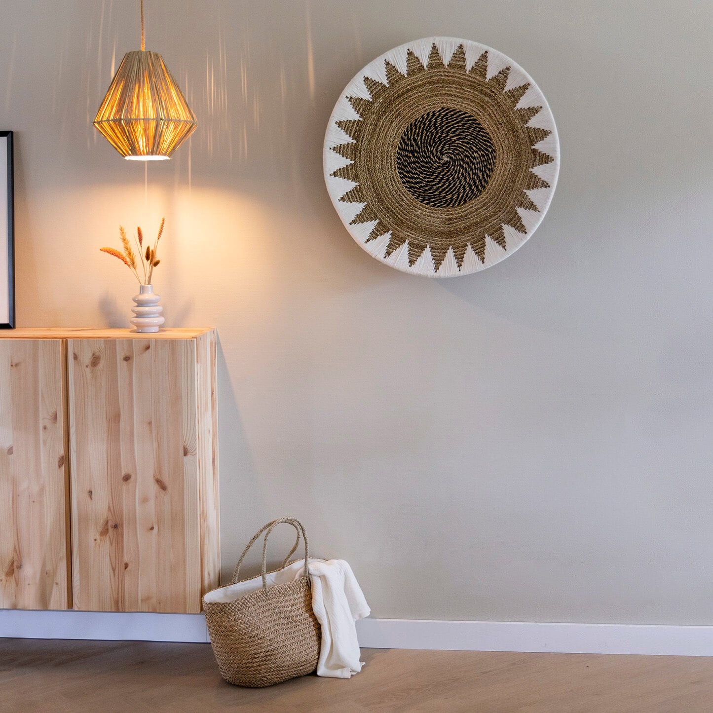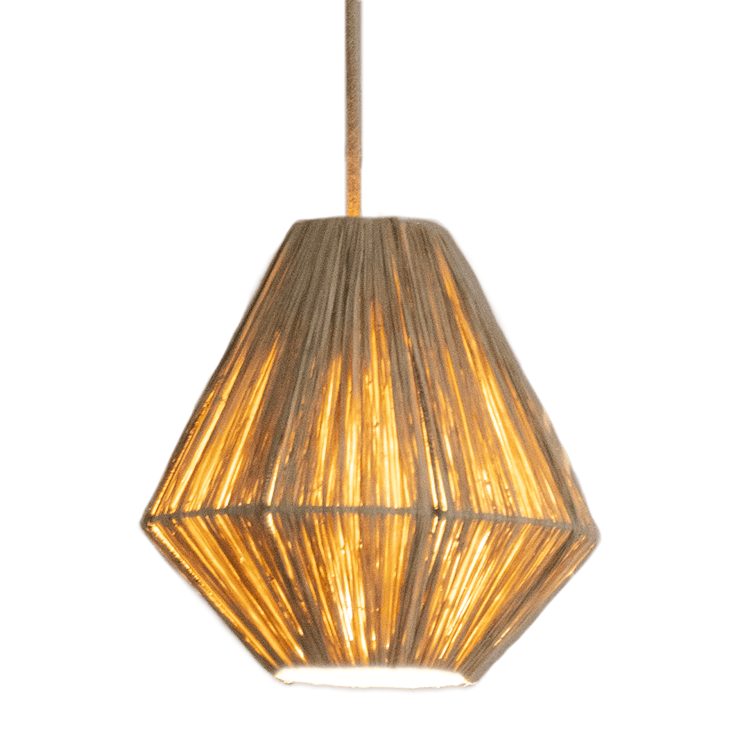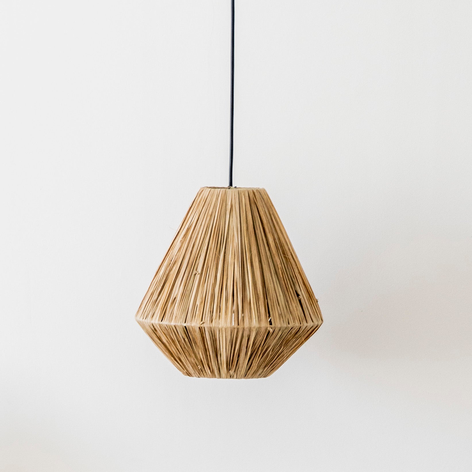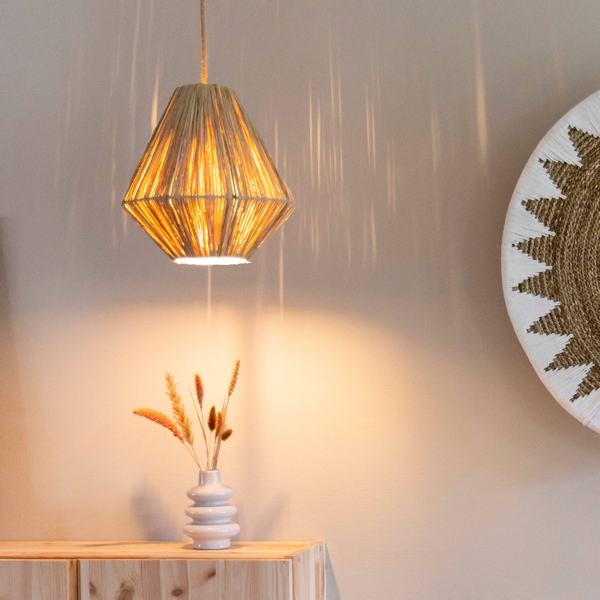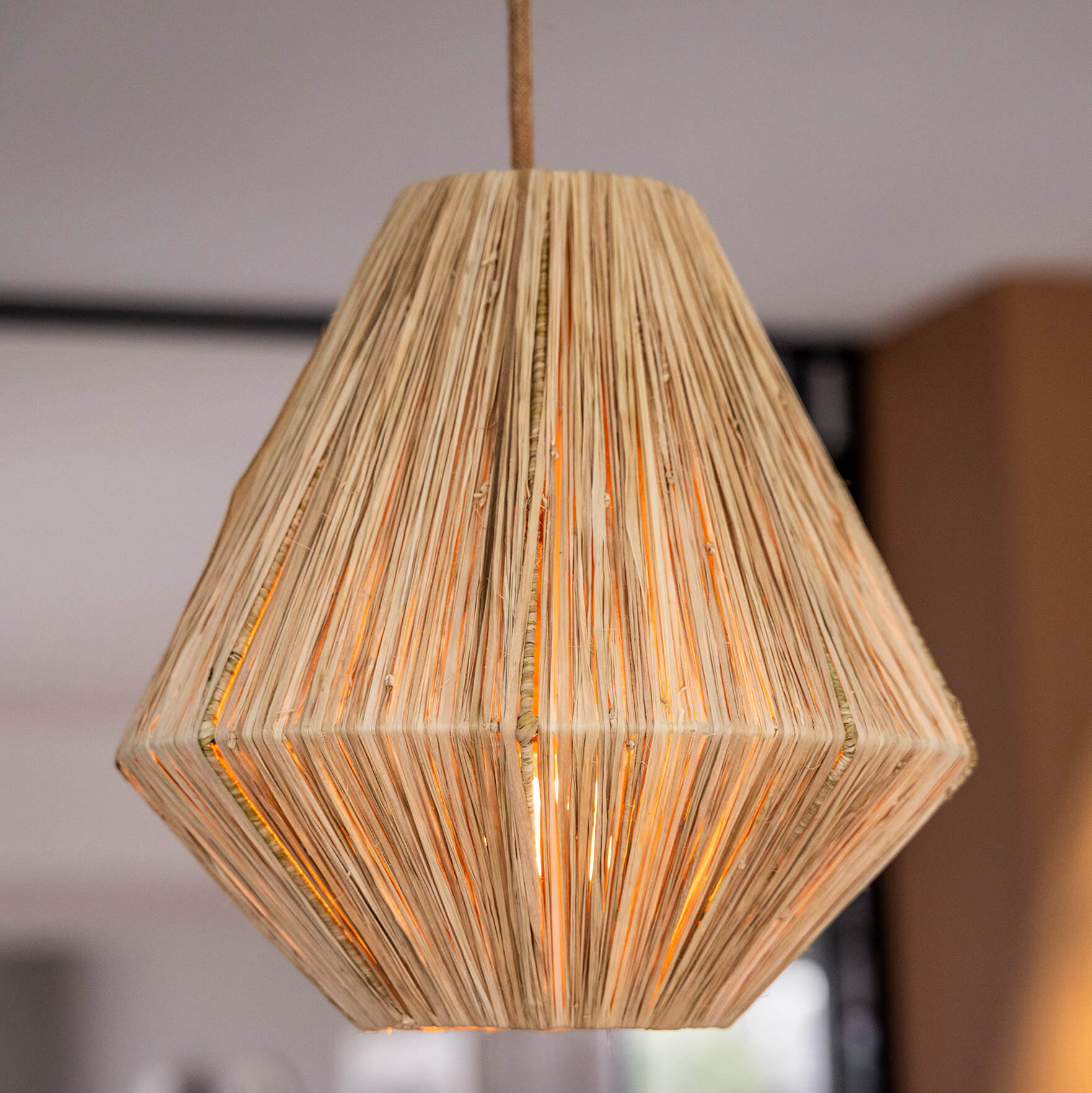 Deze unieke hanglamp uit Indonesië is gemaakt van raffia en heeft een trendy diamantvorm. Door het natuurlijke materiaal en de subtiele kleur geeft de lamp een zacht, sfeervol licht en zorgt hij voor mooie schaduwen op de muur. Perfect als nachtlamp of sfeerverlichting, voegt deze lamp een frisse, exotische vibe toe aan je slaapkamer of hal.