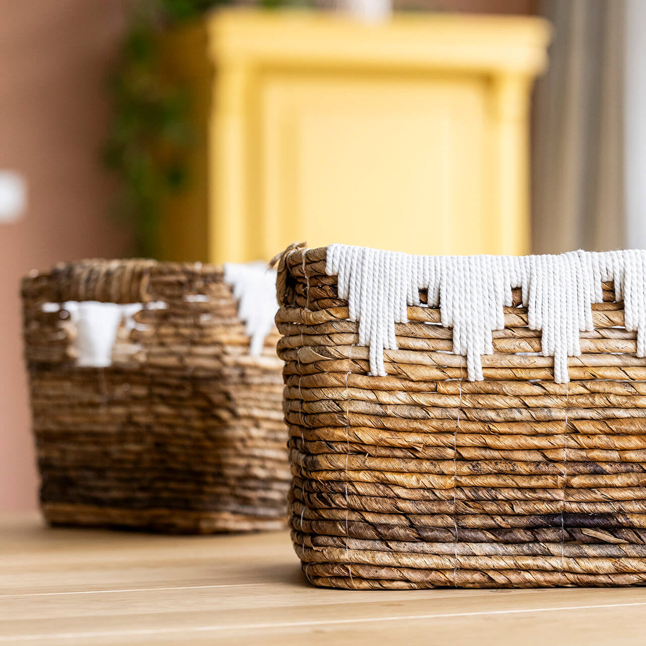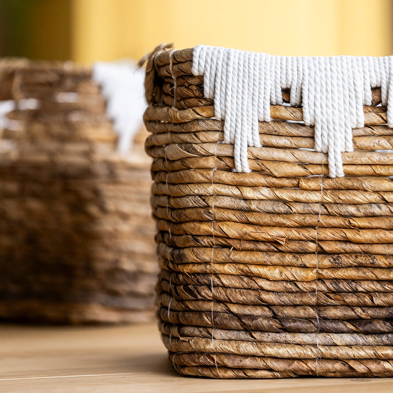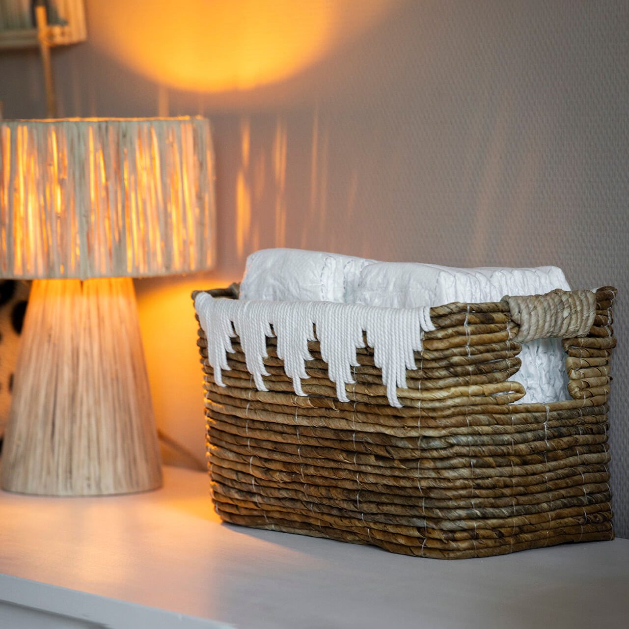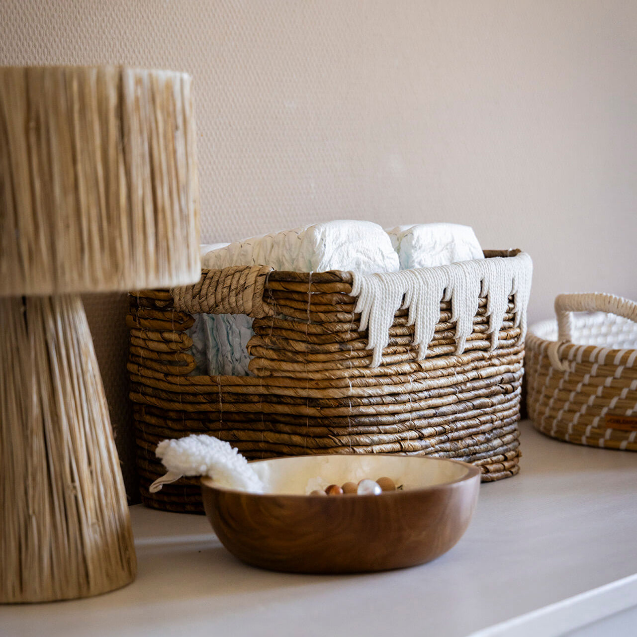Super handig, deze opbergmand. Hij past door het gebruik van natuurlijke materialen en kleuren in elk interieur en je kunt hem voor van alles gebruiken! Voor de tijdschriften naast de bank, voor de luiers in de babykamer, voor de knuffels in de kinderkamer en nog veel meer. De mand is stevig en is gemaakt van gerolde bananenvezels en afgewerkt met macramé van katoen.