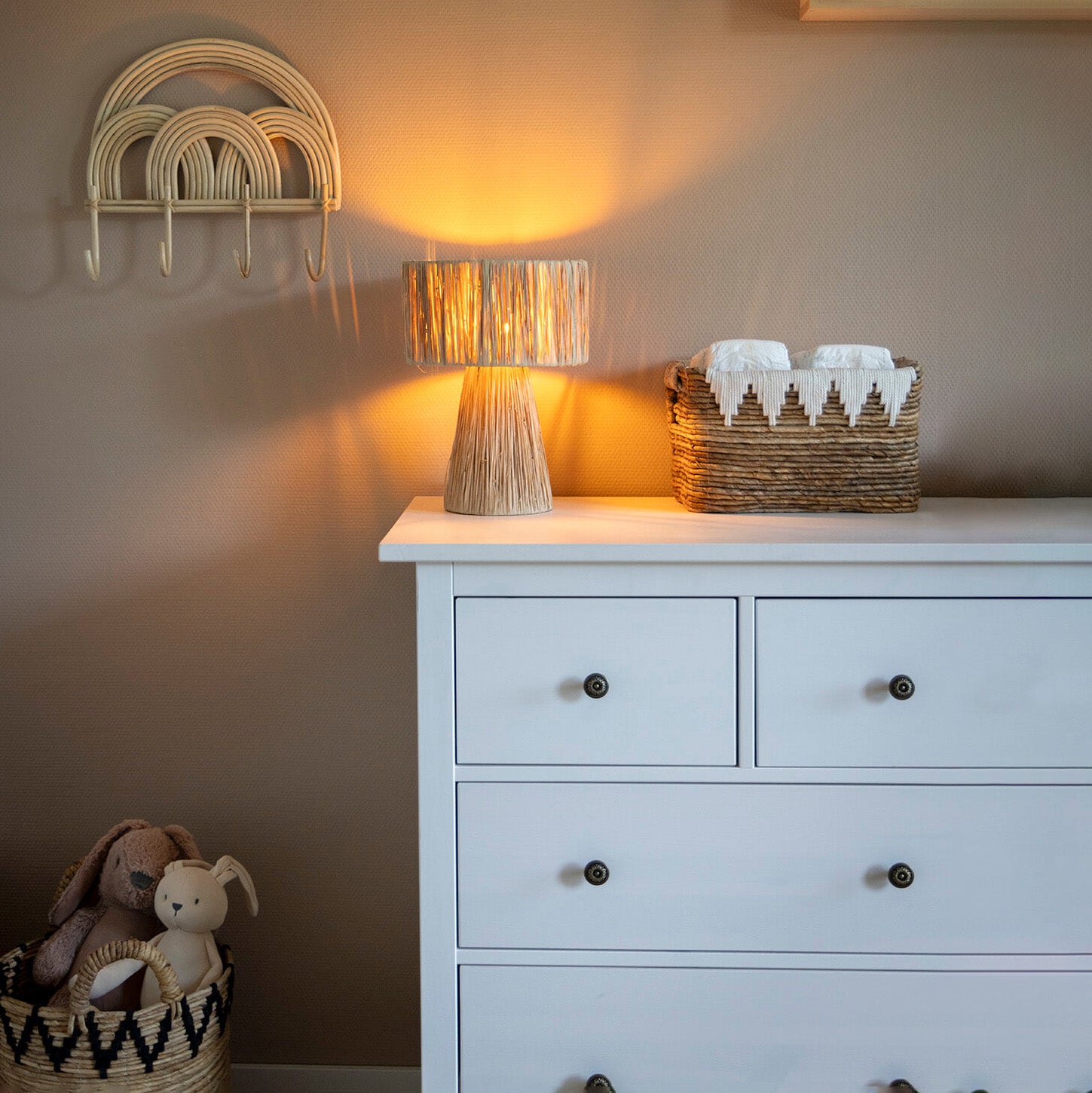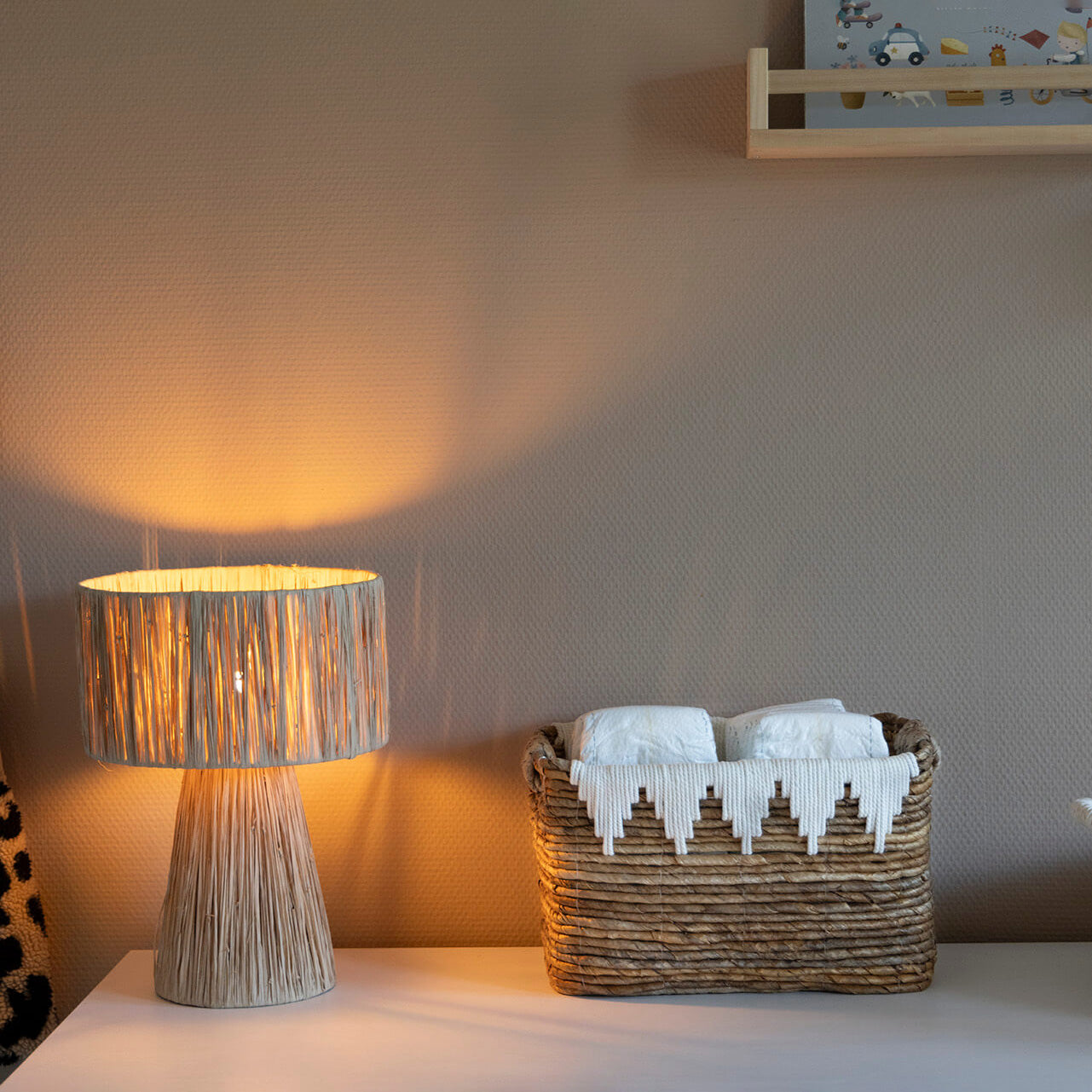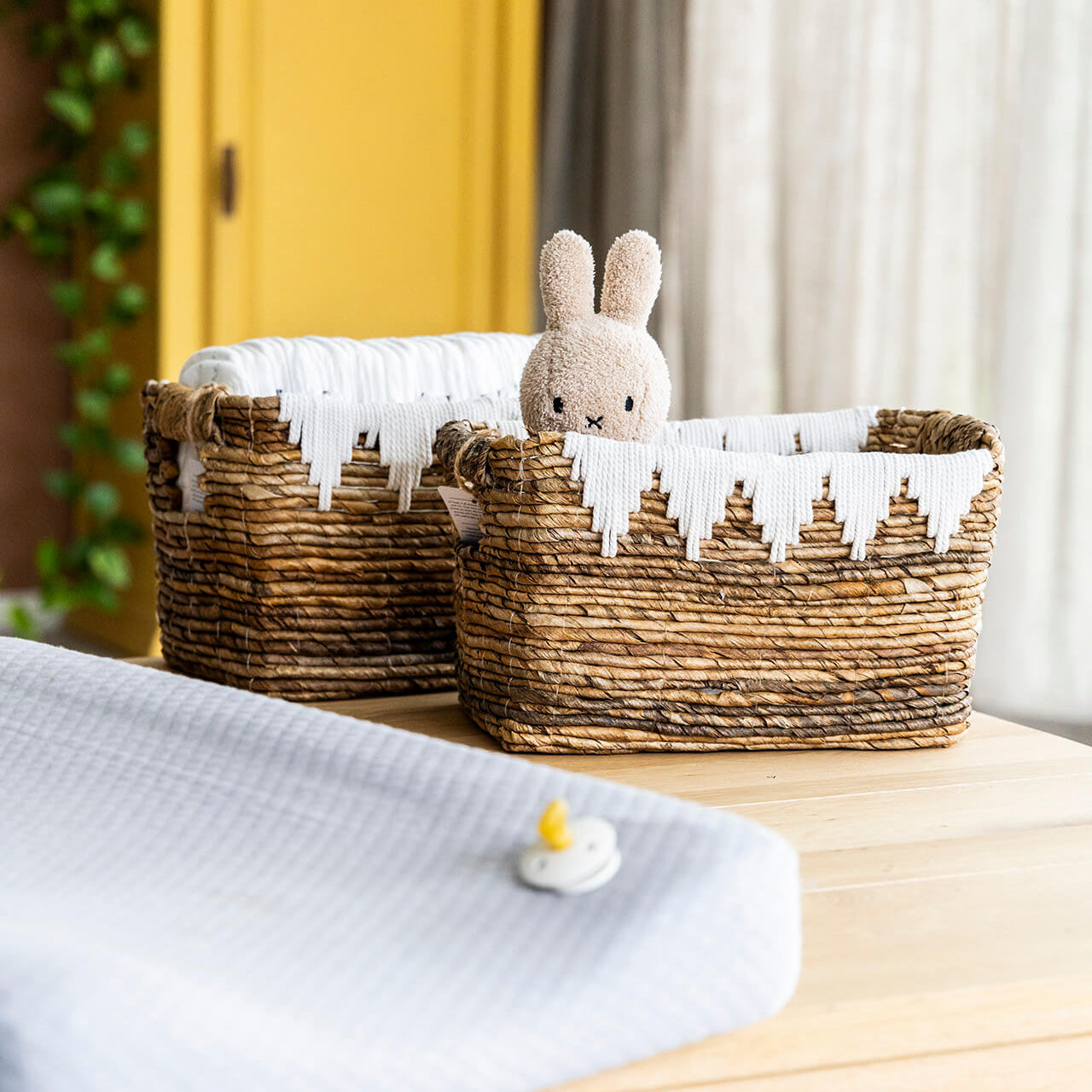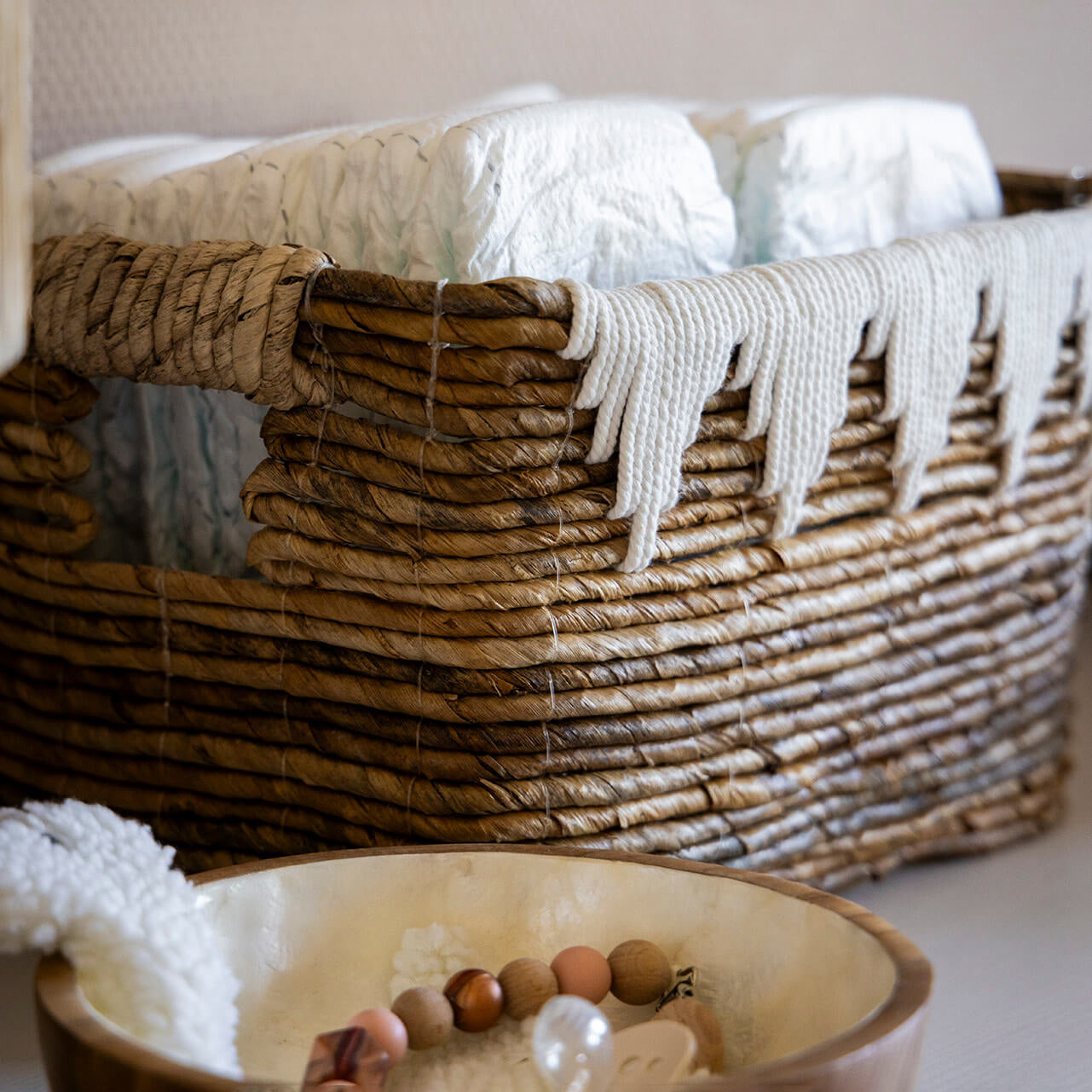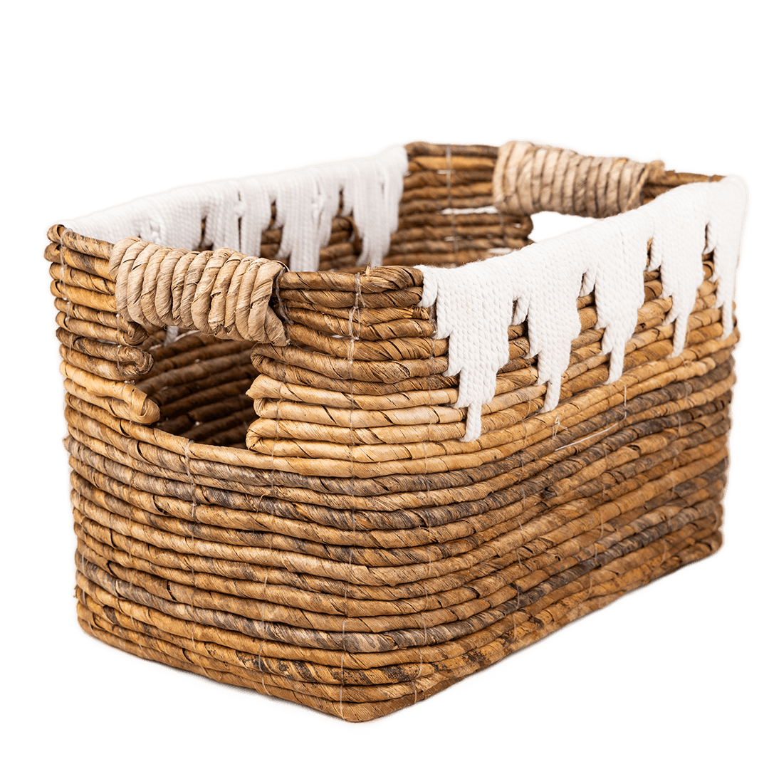 Super handig, deze opbergmand. Hij past door het gebruik van natuurlijke materialen en kleuren in elk interieur en je kunt hem voor van alles gebruiken! Voor de tijdschriften naast de bank, voor de luiers in de babykamer, voor de knuffels in de kinderkamer en nog veel meer. De mand is stevig en is gemaakt van gerolde bananenvezels en afgewerkt met macramé van katoen.