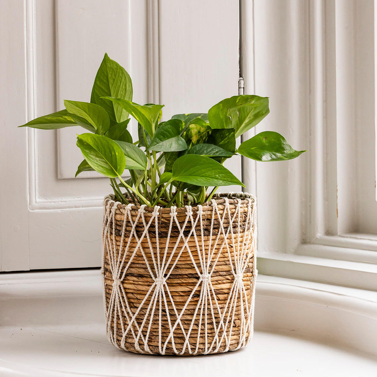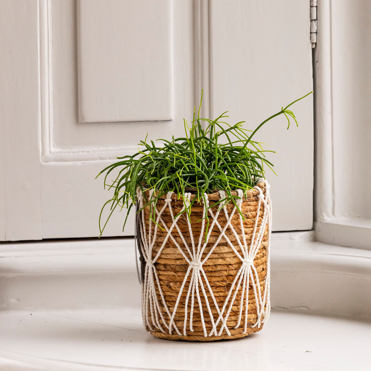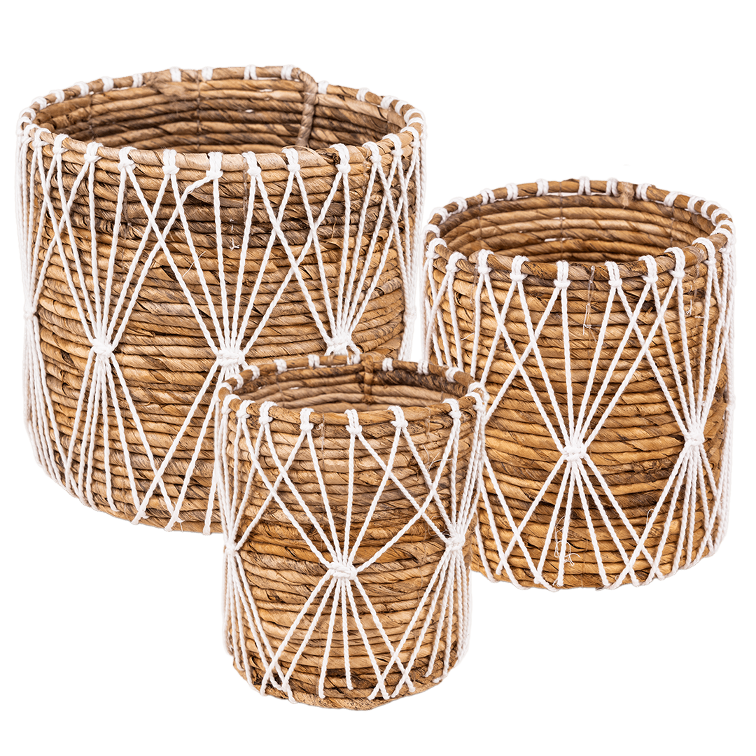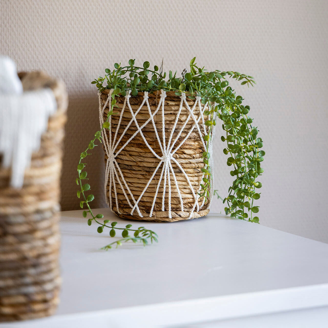 Deze prachtige, handgemaakte manden zijn verkrijgbaar in drie maten. Je kunt ze gebruiken als plantenmand of als mooie opberger in de keuken of badkamer. Ze zijn gemaakt van gerolde bananenvezels en afgewerkt met macramé van katoen.