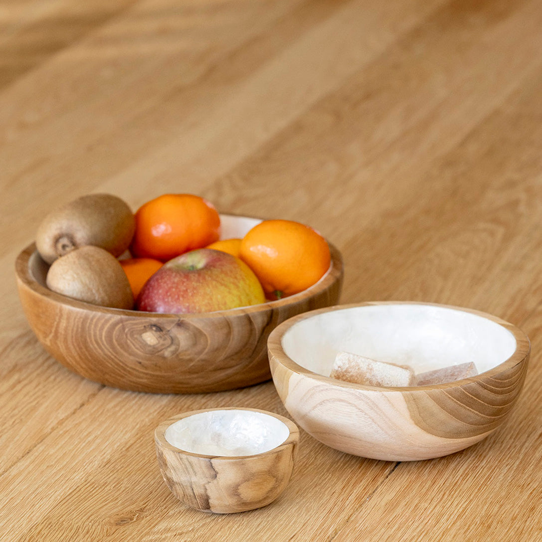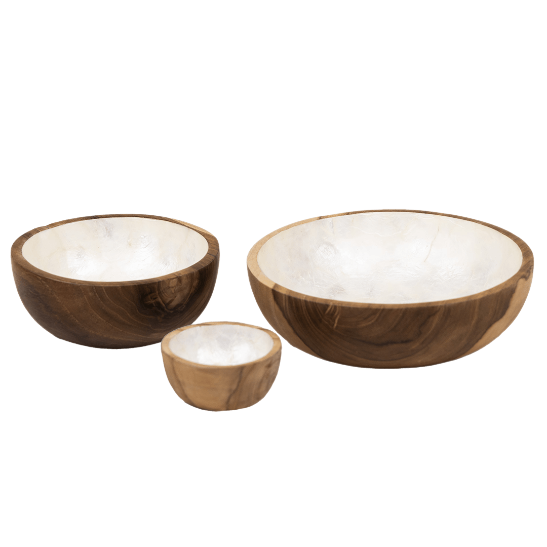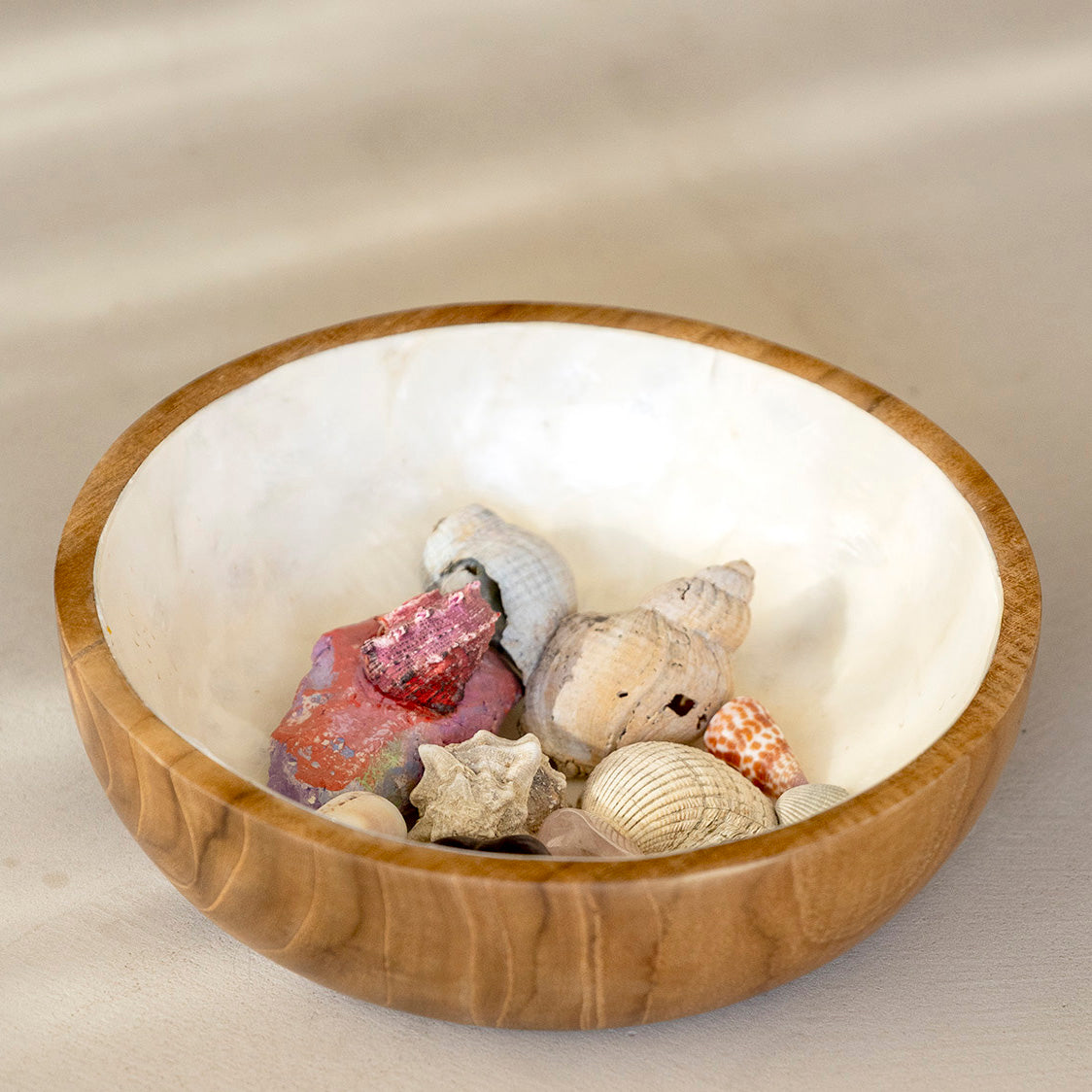 Deze schaaltjes zijn niet alleen mooi, maar ook super praktisch! De binnenkant is afgewerkt met glanzend parelmoer, wat zorgt voor een luxe uitstraling. Deze houten schaaltjes zijn in verschillende maten verkrijgbaar.