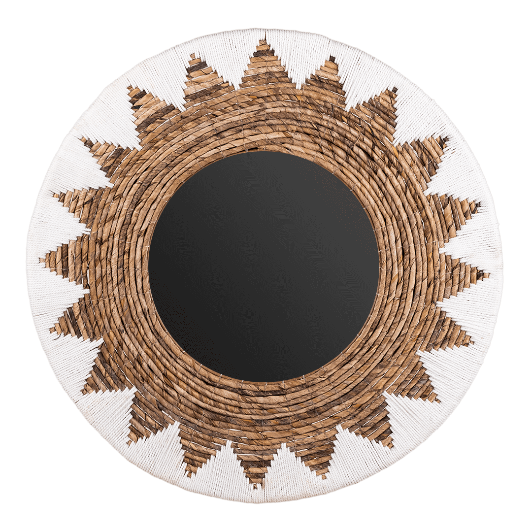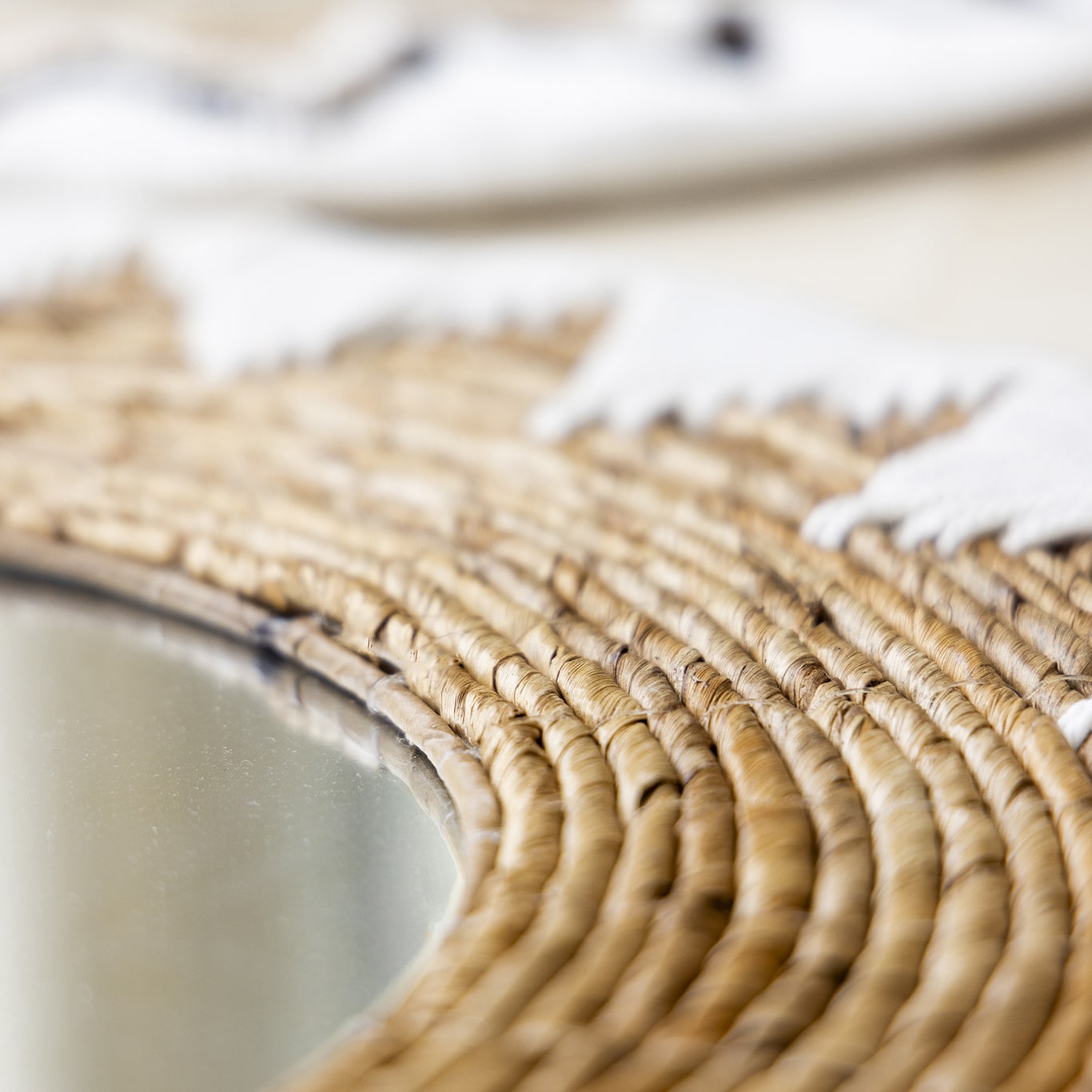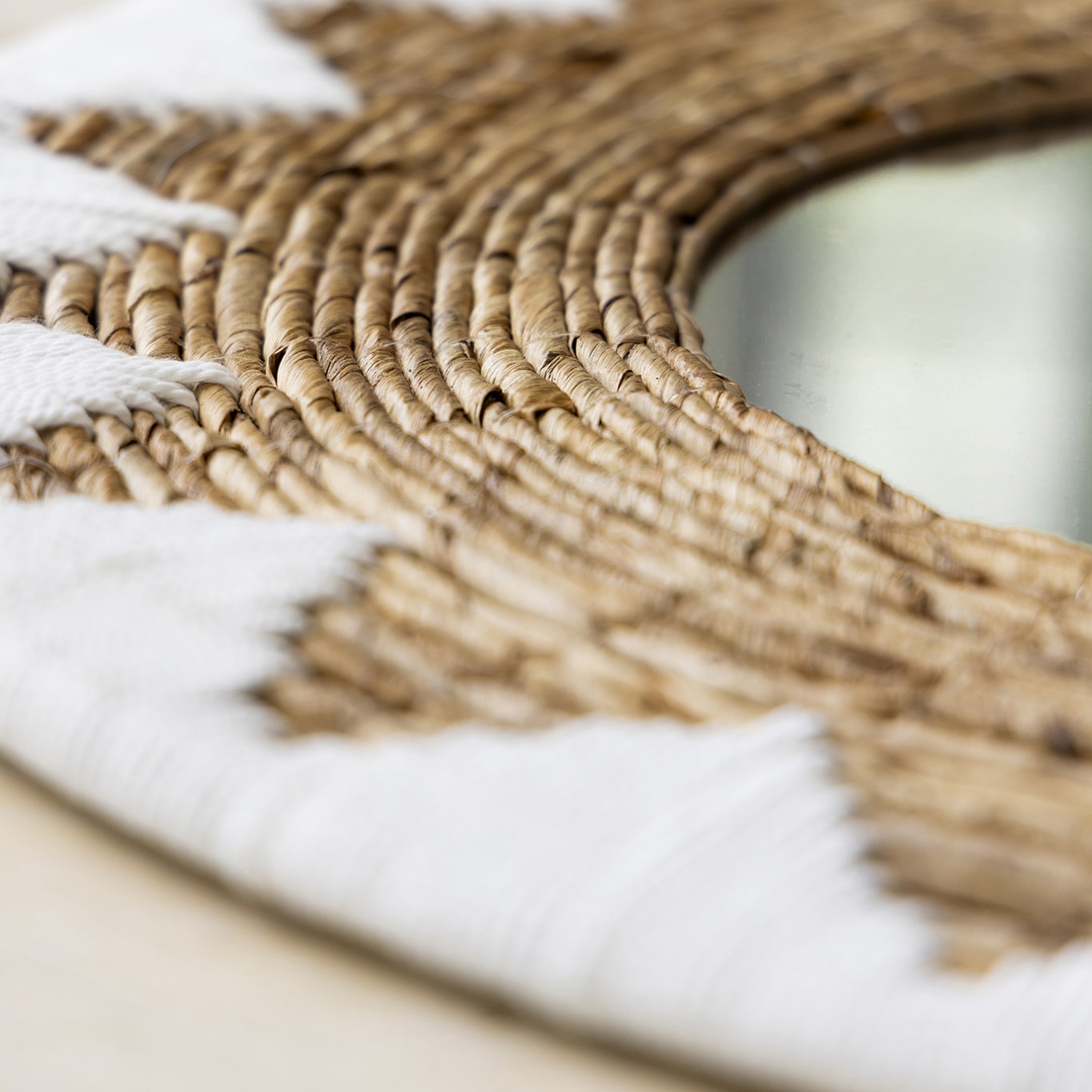 Deze elegante spiegel heeft een subtiel motief in macramé, gemaakt van mendong en katoen. Dit geeft een unieke en stijlvolle uitstraling aan elke ruimte.