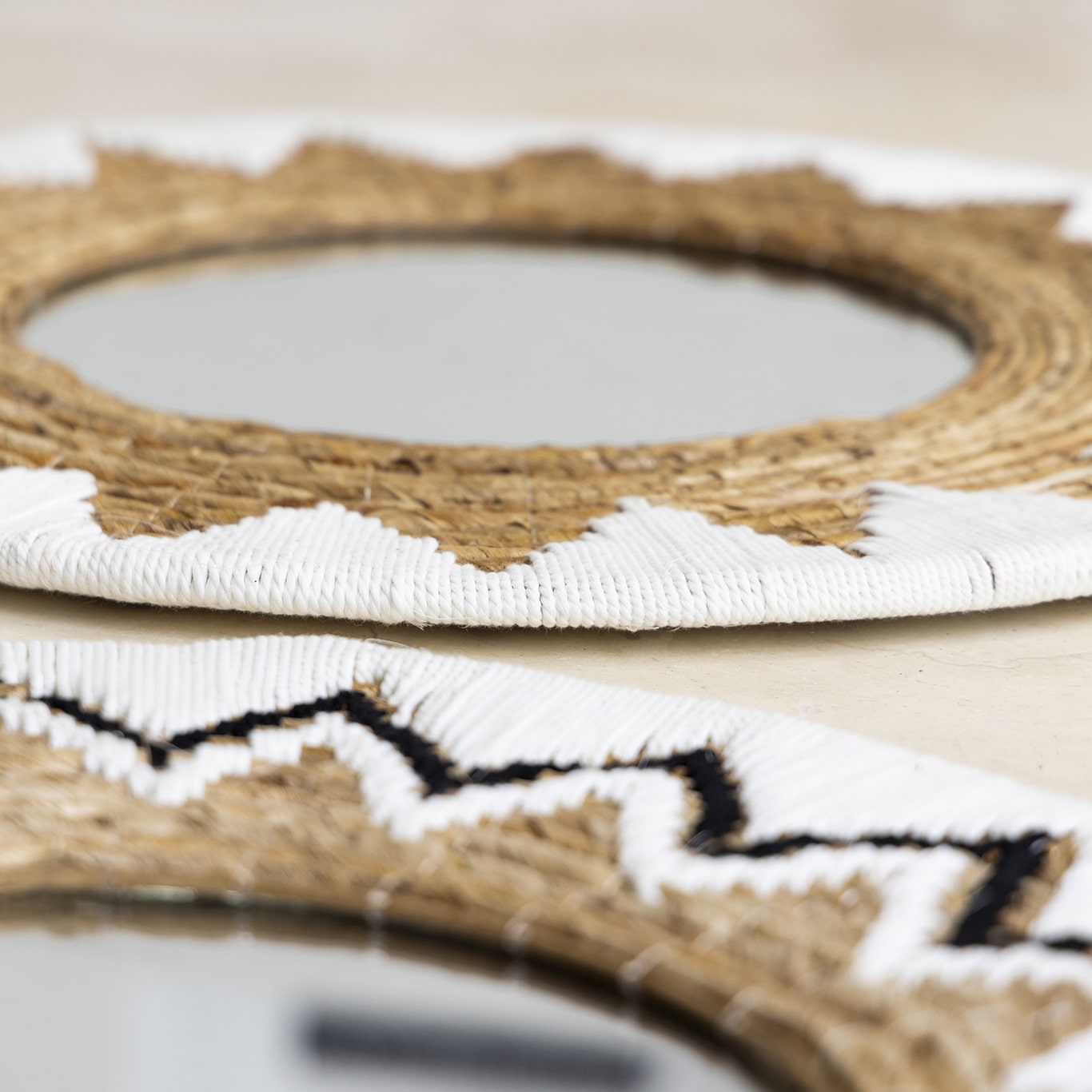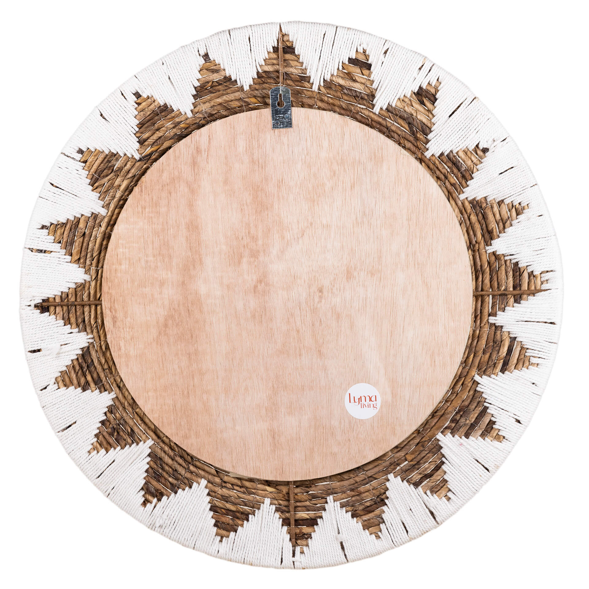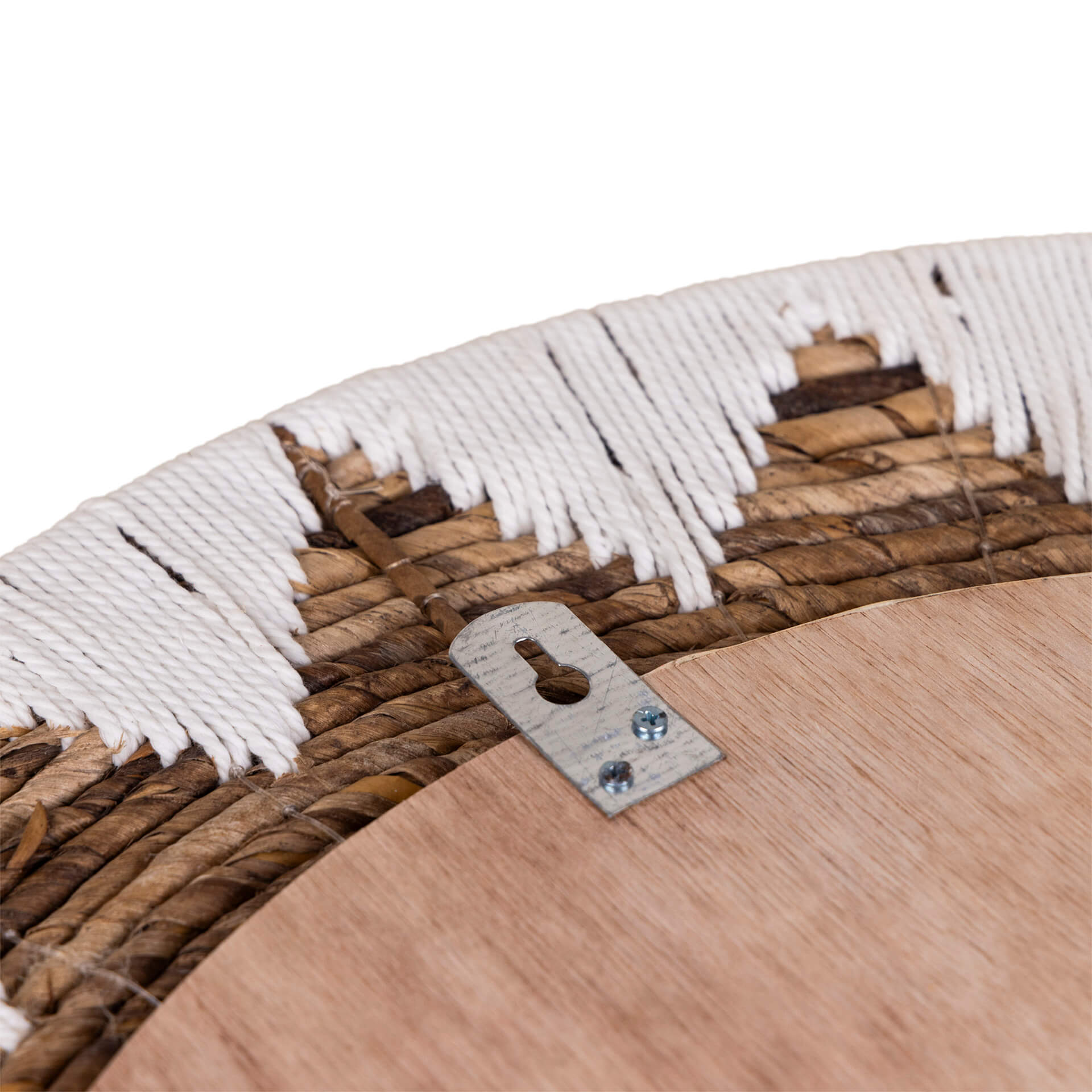 Deze elegante spiegel heeft een subtiel motief in macramé, gemaakt van mendong en katoen. Dit geeft een unieke en stijlvolle uitstraling aan elke ruimte.