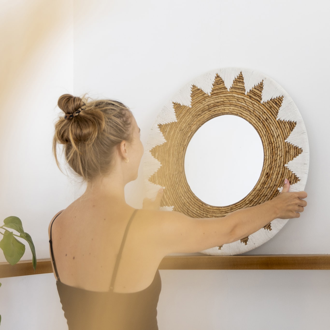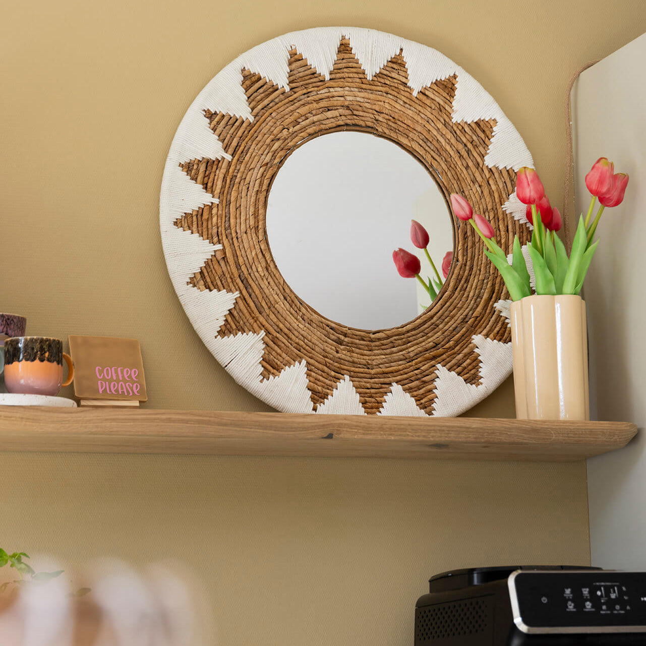 Styling tip: Hang deze spiegel in een lichte ruimte voor een fris effect of combineer met andere wandschalen in de hal, slaapkamer of woonkamer.