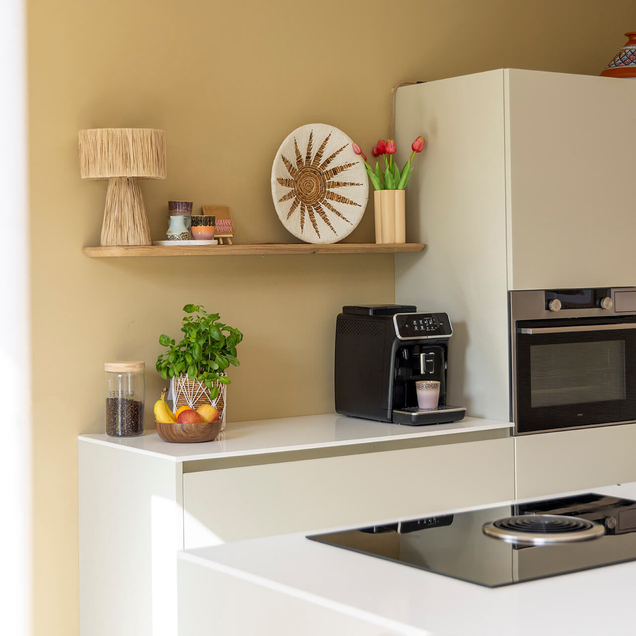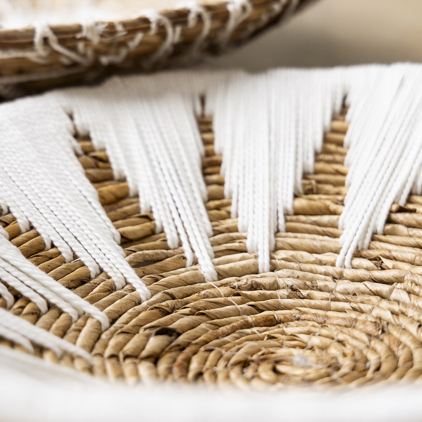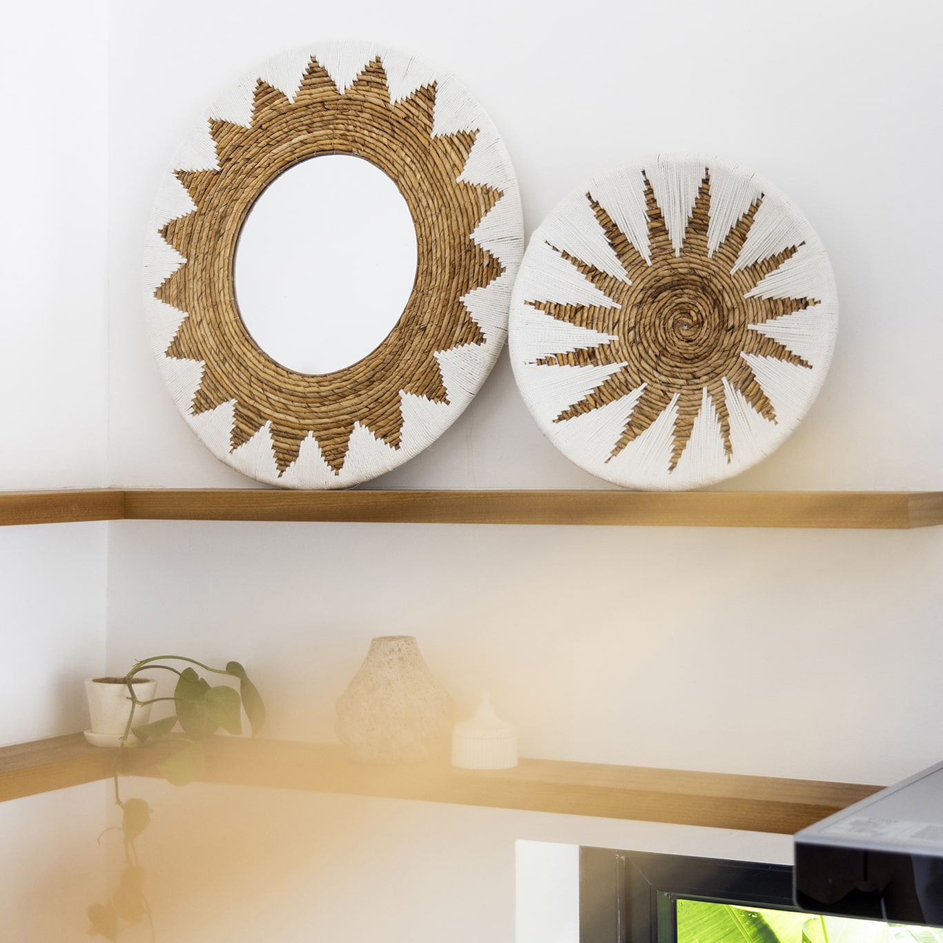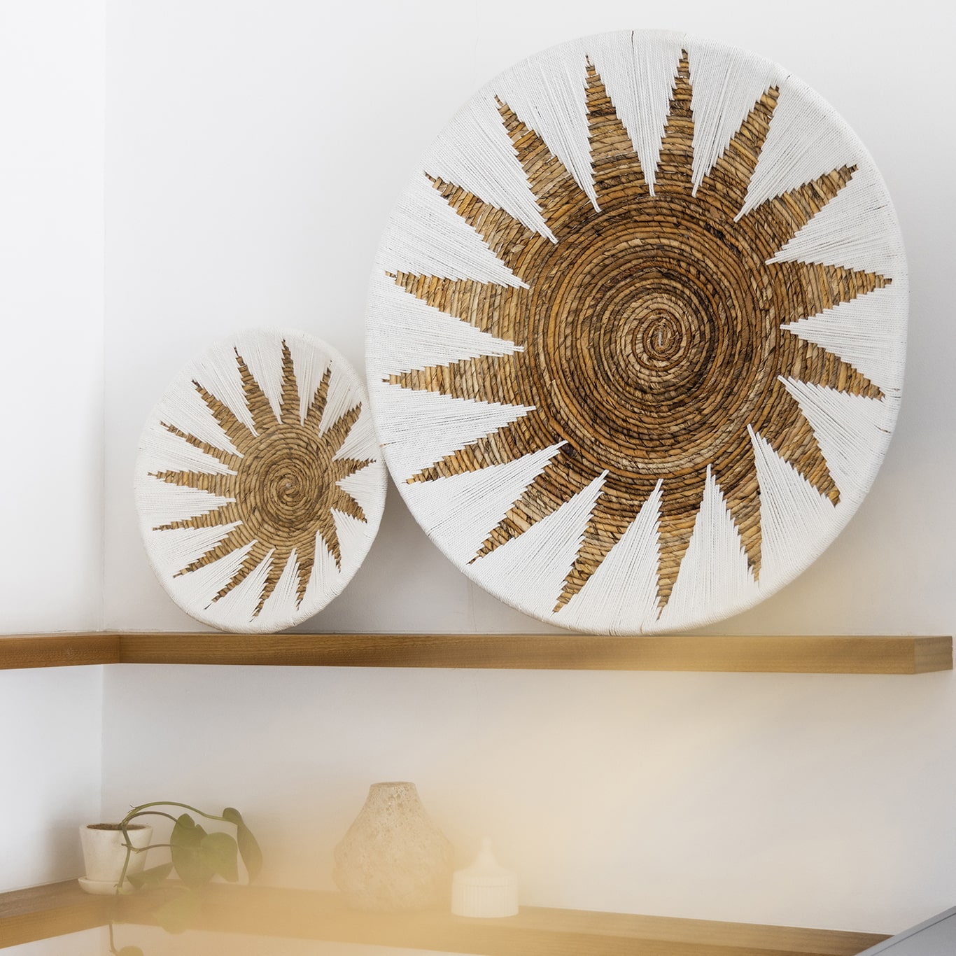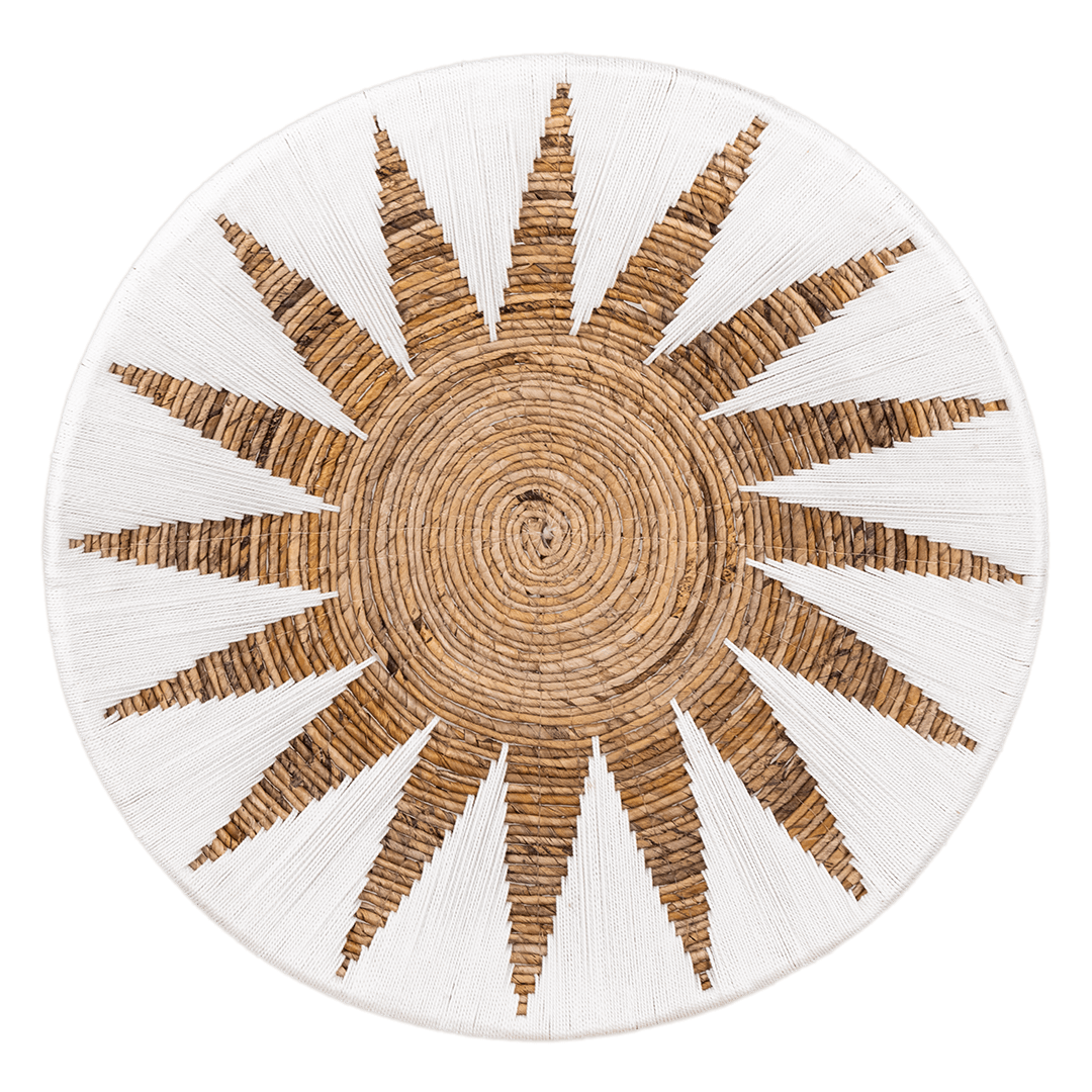 Breng natuurlijke charme aan de muur met de Wandschaal Matahari, gemaakt van bananenblad en katoen in natuurlijke tinten met wit. Dit zonvormige macramé patroon creëert een stralend middelpunt dat elke ruimte een warme, bohemien sfeer geeft. Verkrijgbaar in twee maten voor een speels effect: klein (40 cm) en groot (70 cm). Deze unieke wandschaal is perfect om sfeer en karakter toe te voegen aan elke muur.